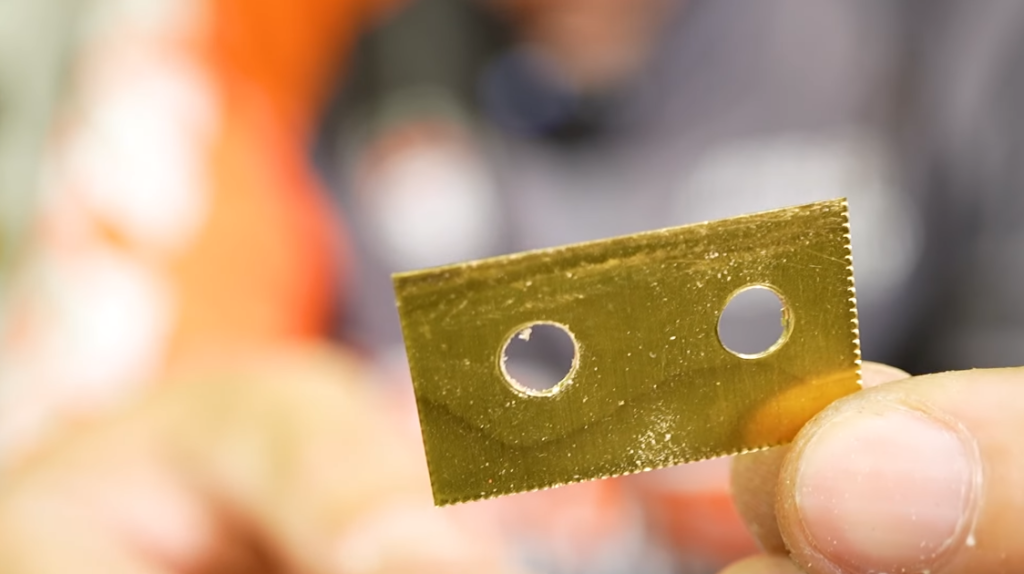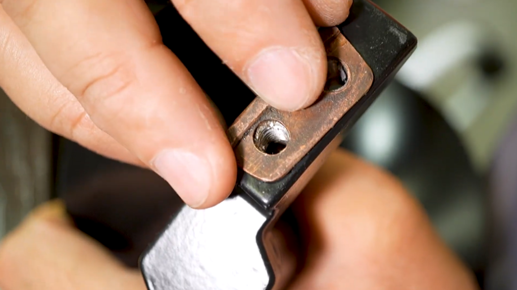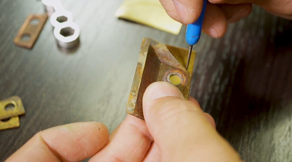 Остаётся подровнять молоточком и убрать заусеницы надфильком. Помните, что, скорее всего, вам эта прокладка понадобится, когда будет большой мороз. Поэтому всё-таки болтик должен туда довольно легко проходить, потому что на морозе менять ножи, ставить прокладки — это не очень интересное занятие.