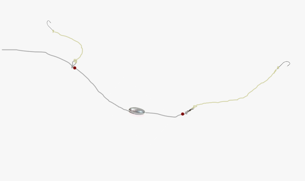 Такая у нас получилось нехитрая снасть: верхний поводок, скользящий грузик, вертлюжок, и нижний поводок, ничего хитрого в этой снасти нету.