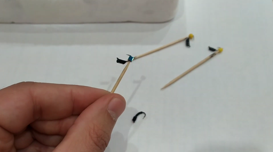 Затем «лесотки», разнообразные «лесотки». Обычно я их обозначаю двумя кембриками: жёлтым и красным. Очень хорошо собирает плотву, но и окунь, естественно, тоже не проходит мимо.