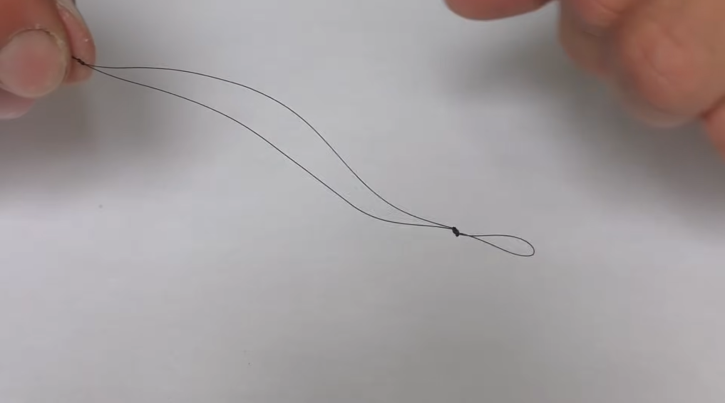 И давайте теперь попробую прикрепить оснастку к кончику моей удочки, не побоюсь этого слова, херабуны, всё, что мне нужно теперь, из большой петли сформировать удавку, получилась скользящая удавка, которая будет сама затягиваться.
