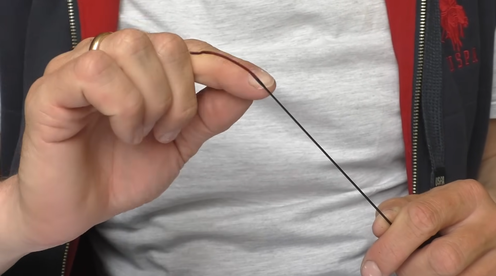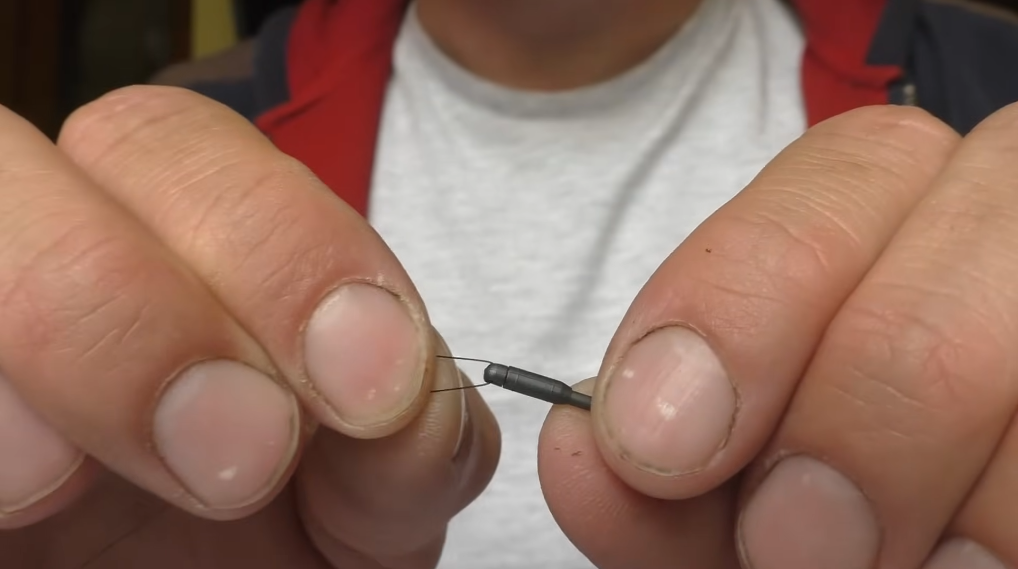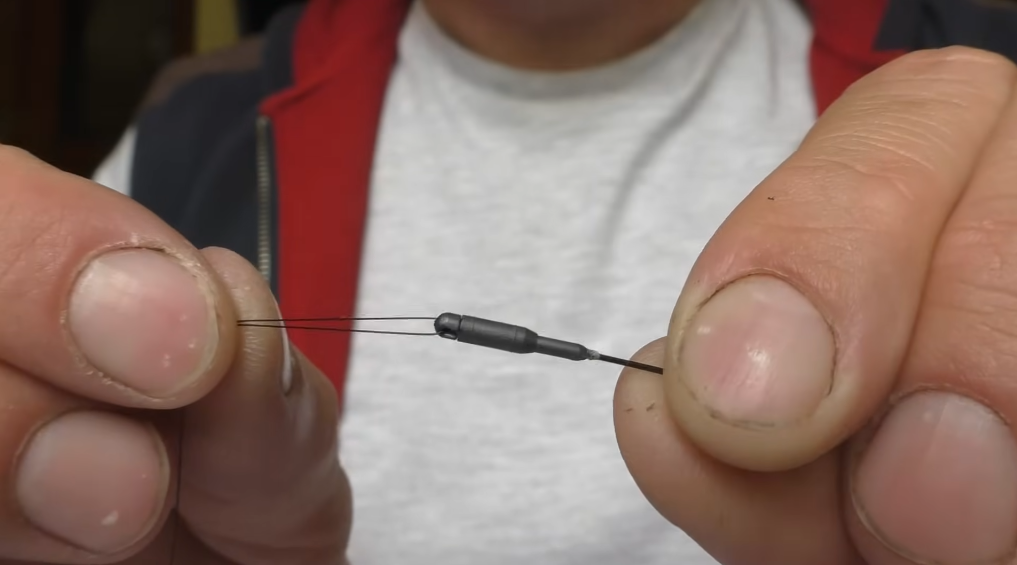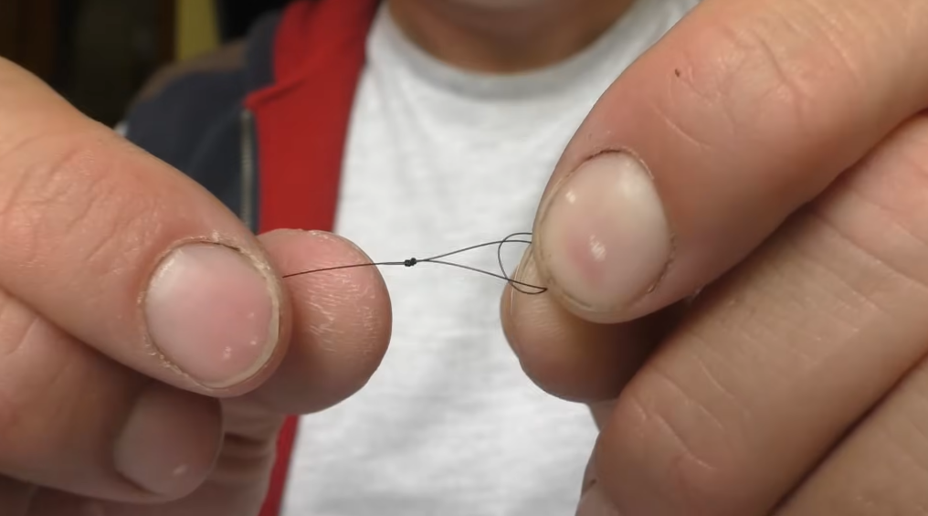 Сначала на леску надеваю длинный кембрик, пропускаю его через всю длину и оставляю на леске, дальше надеваю второй кембрик, теперь на конце лески можно, но не обязательно, но я обычно это делаю, я завязал узелок, просто обычный узелок, ничего сверхъестественного.