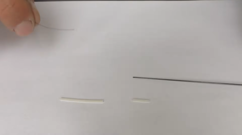Дальше я отрезаю от этого кембрика примерно 1/4 часть по длине и показываю, каким образом всё это дело крепить. Итак, вот моя леска, вот хлыст удочки, вот первый кембрик, второй кембрик.