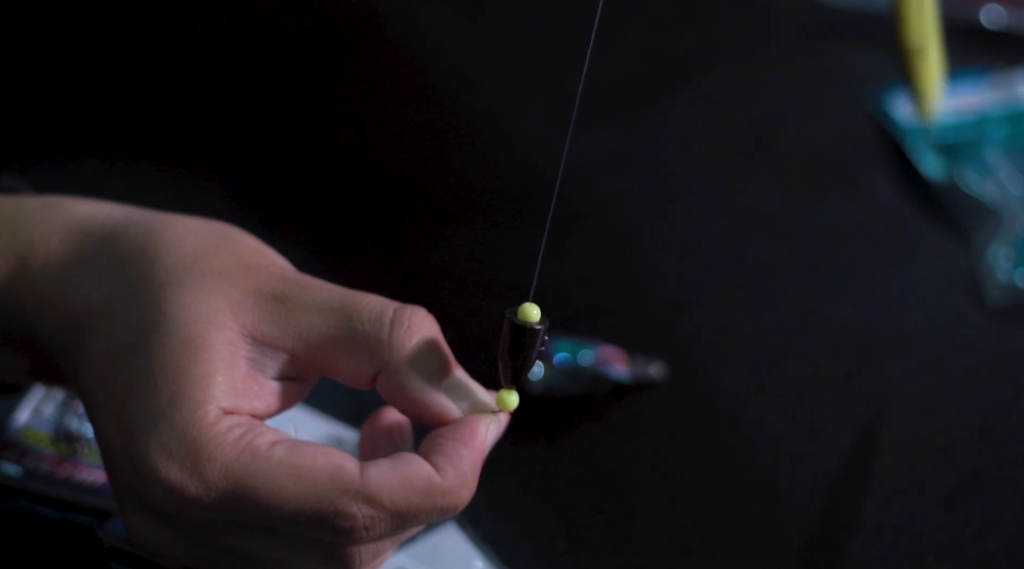 Берем бусины, на один отрезок надеваем одну бусину, сверху пулю и сверху еще одну бусину. Теперь на конце одного поводка я привязываю вертлюжок безузловку, он вяжется на конце оснастки и будет крепиться к основному шнуру.