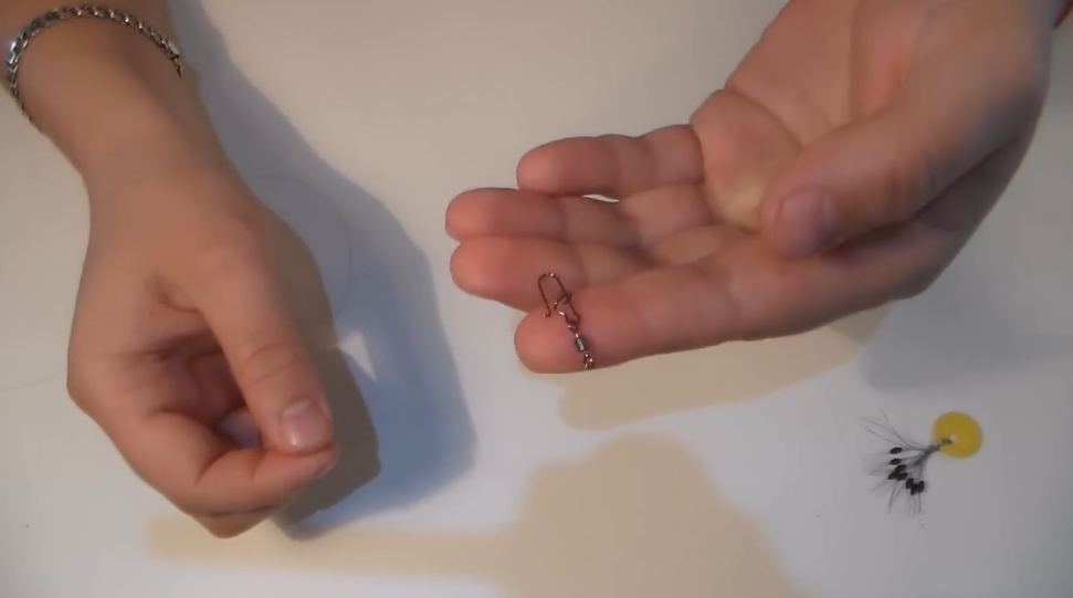 Одели стопор, немножко протянули, теперь берём карабинчик с вертлюжком для того, чтобы мы могли одеть поплавок.
