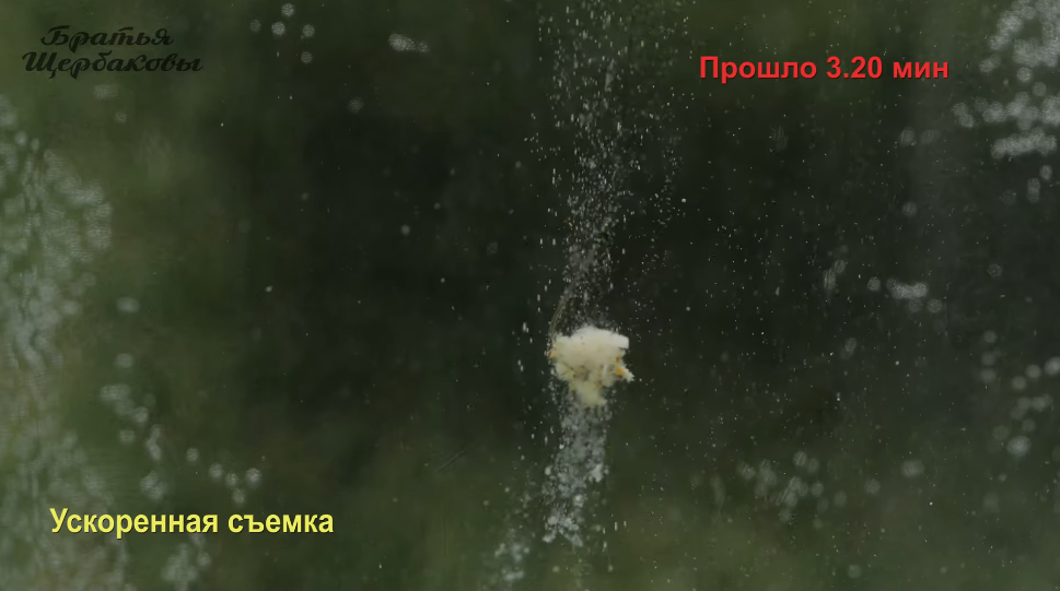 Формируем на крючке колобок и опускаем в воду. Время пошло. Колобок теста начинает интенсивно пылить и постепенно сыпаться.