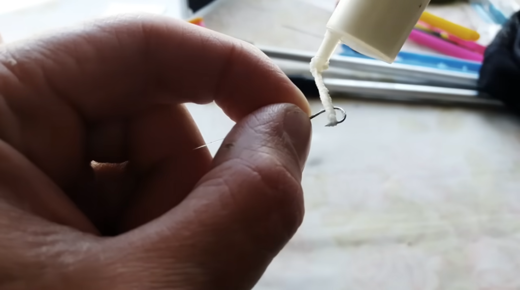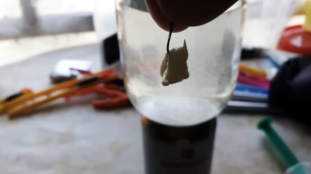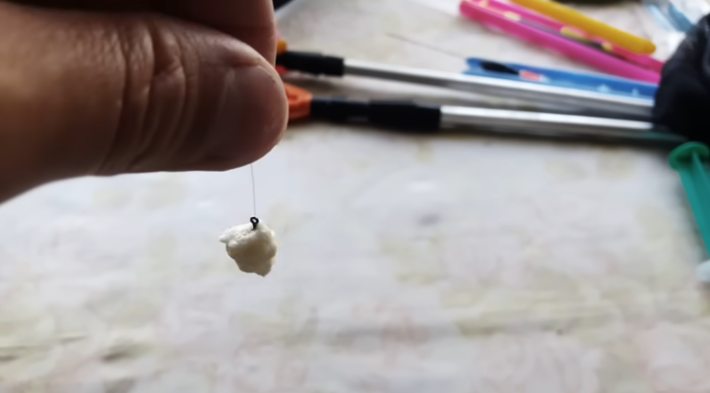 Самый главный фактор, влияющий на время удержания приманки на крючке, — это количество витков, вложенных в комок манки, сами понимаете, чем больше витков, тем плотнее получается сам комок. Берем, фиксируемся на острие крючка и, растягивая манку, делаем несколько витков.