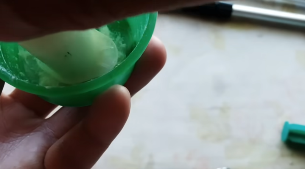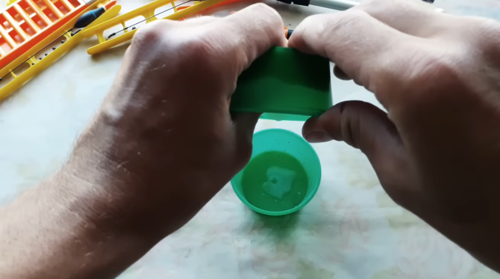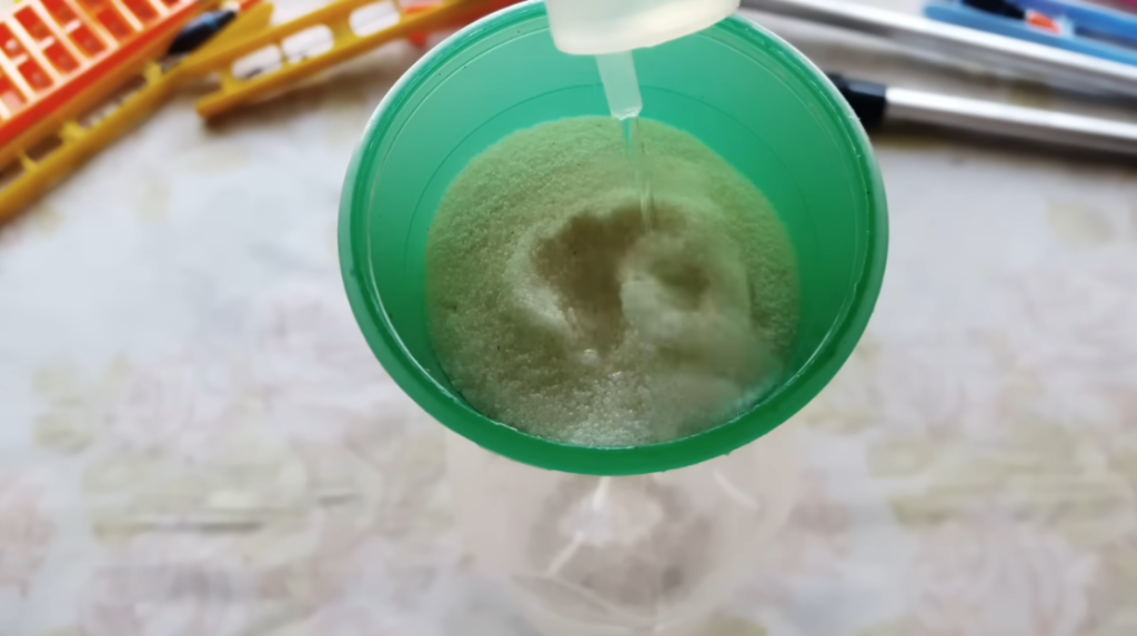 Беру коробочку для опарышей, насыпаю такое количество манки, чтобы мне хватило на один шприц, и наливаю воду, самое главное — это налить достаточное количество воды, краника у меня под рукой нет, поэтому я буду наливать шприцом, в который буду заряжать свою готовую насадку.