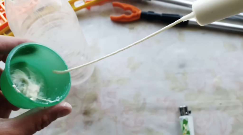 После того как всё втянули, вставляем поршень, немножечко выдавливаем, видим, как получается, как она тянется, немножко выдавливаем, чтобы был запас, немножко вернуть назад, и я, если готовлю манку с вечера, еду на рыбалку утром, то в холодильнике она не портится, за ночь хорошо настаивается, а чтобы манка не засыхала, в носик шприца нужно вставить спичку.