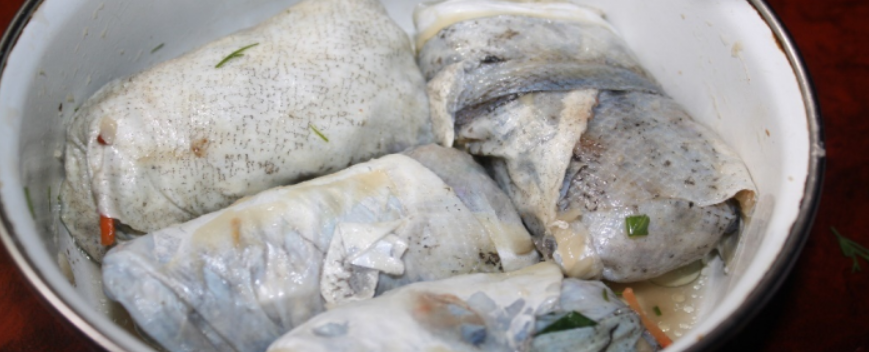 Из рыбного фарша влажными руками сформовать продолговатые галки (размер ориентировать на форму для заливных блюд), завернуть в рыбью кожу (или фольгу, которую после приготовления удалить) и варить на пару около 30 минут.