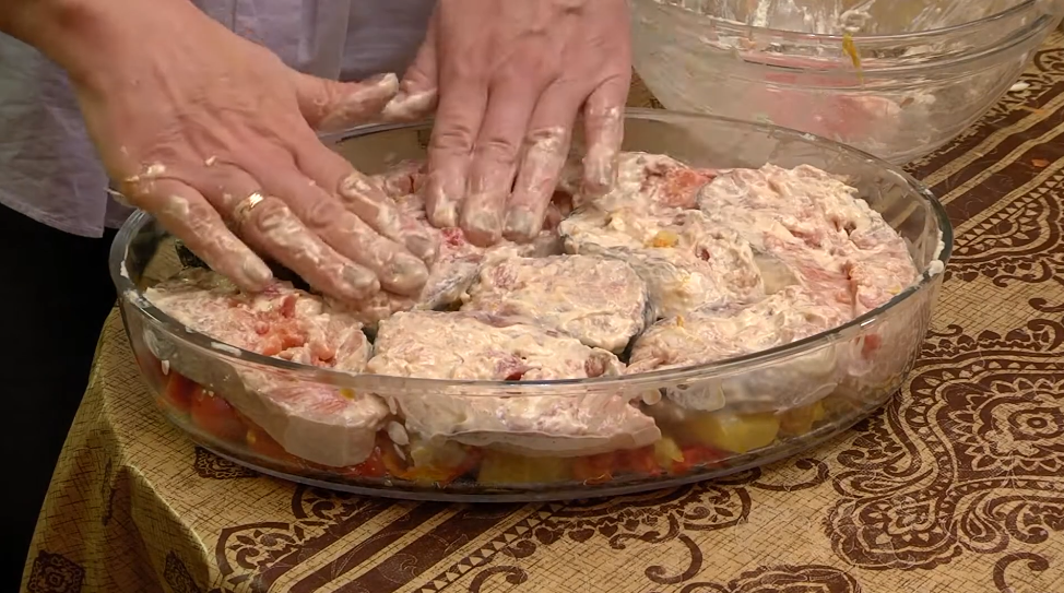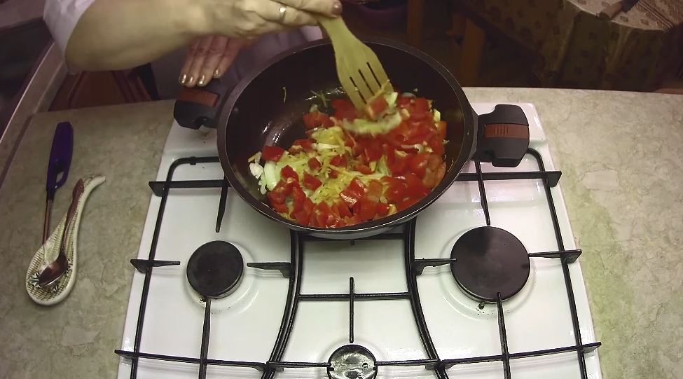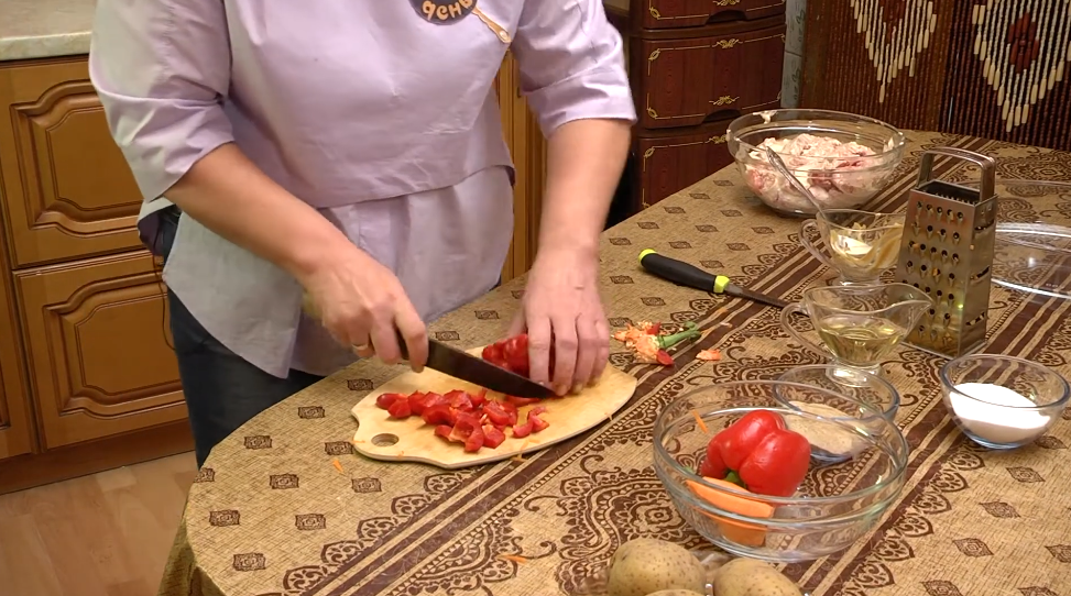 Всё перемешиваю и отправлю сюда перчик, оставляем так на несколько минут и займемся картошкой.