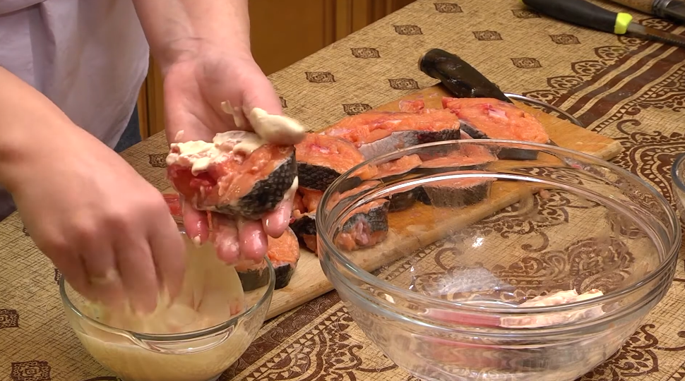 Сегодня у нас рыбный день, и я буду готовить семгу. Вот такая у меня большая сегодня рыбина, нам ее привезли из Архангельска, это архангельская семга, я ее уже почистила, выпотрошила, хвостики вначале отделю, они мне потом пригодятся для ухи, и теперь оставшийся кусок я порежу на стейки.