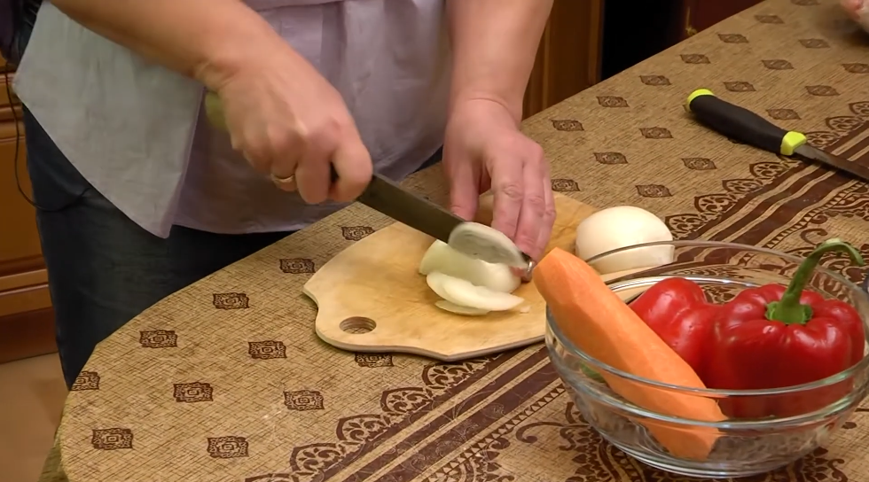 Вначале я поставлю сковородку на огонь, добавляю в нее растительное масло, пока масло разогревается, я порежу лук, первым я буду обжаривать лук, лук я буду полу-полукольцами нарезать, мельче не нужно. Можно добавить баклажаны, можно добавить грибы.