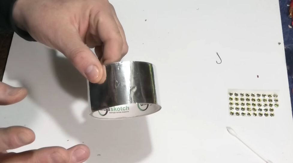 А для того чтобы сделать такую снасть, нам всего лишь понадобится крючочек маленький, подбираете под свои условия, ватная палочка, фольгированный скотч и также трубочка от капельницы.