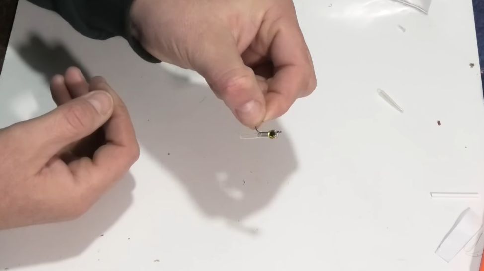 И у нас практически вот такой малёчек, пыздрик, как я его называю, на него очень хорошо ловится рыбка, и чтобы дополнительно больше привлекать рыбку, я клею еще глазки, можно, конечно, глазки не клеить, это уже дело лично каждого, но я хочу, чтобы было красиво, и мне было красиво, и рыбке было красиво.
