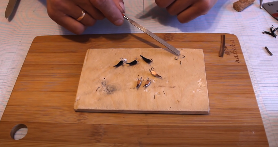 Обрабатываем заготовку напильником и подгибаем - делаем нужный нам загиб, чтобы мормышка играла правильно.
