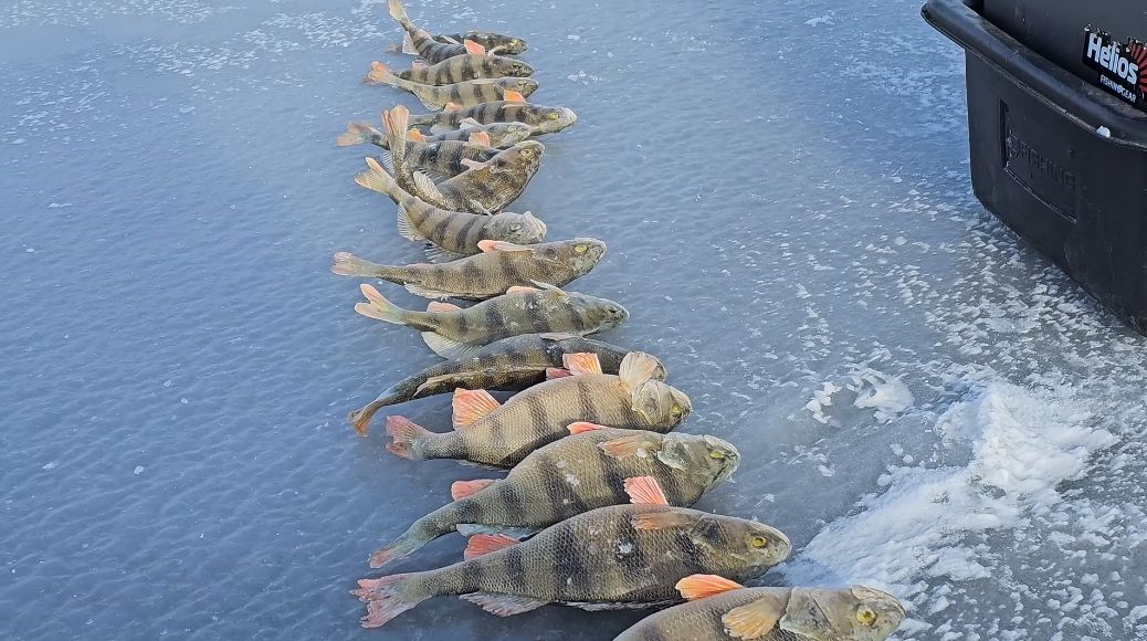 Первая лунка и поклевки одна за другой, но окунь как известно ходит не большими стайками. Хирургические ножницы обязательно, иначе замучаешься окуней отцеплять с балансира.