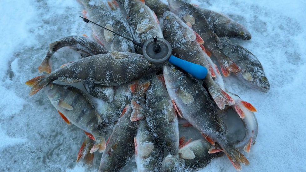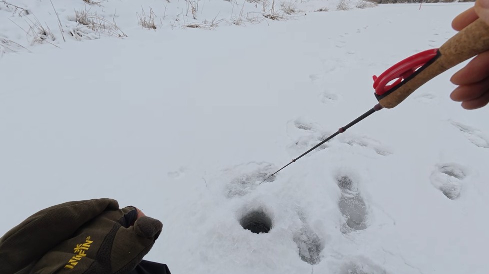 Прошелся по всем лункам на балансир, поклевок нет, поставил блесенку самую маленькую и тоже голяк, решил перейти на безмотылку, что-то не клеится у меня с блесной на этом водоеме. Посмотрел в камеру, окунь есть, надо как-то с ним договариваться.