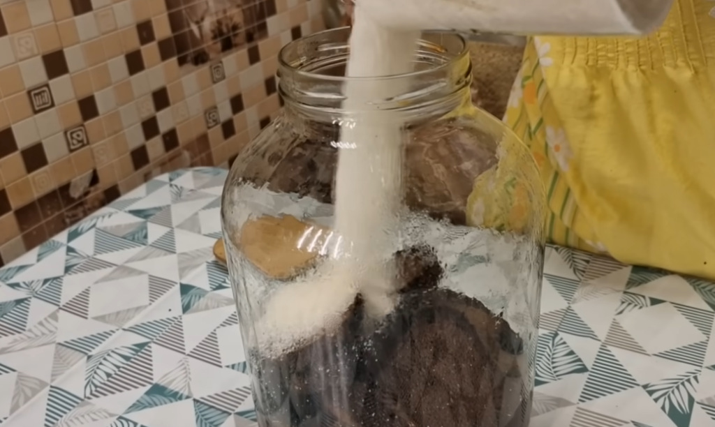 И добавляем сюда примерно полстакана сахара, это нужно для заквашивания.