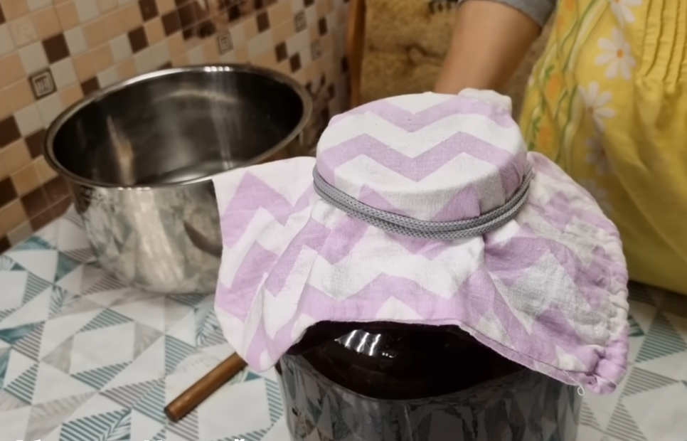 Убираем в тёплое место и периодически в течение двух дней достаёте и мешаете, то есть взяли банку, сняли тряпочку, помешали, поставили, и так, скажем, каждые 5 часов. Через два дня будем продолжать готовить квас.