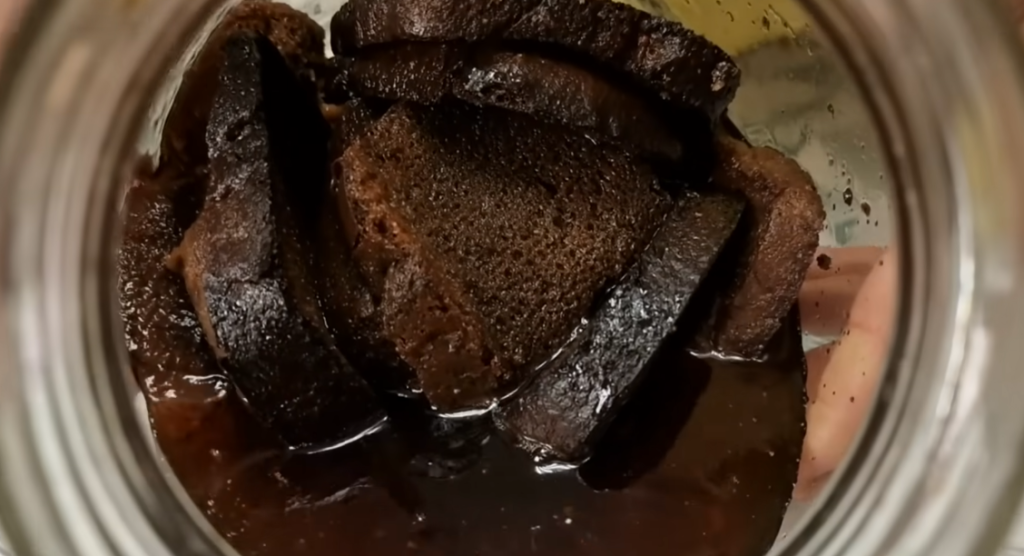Вот и квас наш поспел, убираем хлеб сверху, хлебушек поднялся, всё, квас готов. А вот теперь самый интересный процесс, берём баночку и процеживаем в чистую баночку квас.