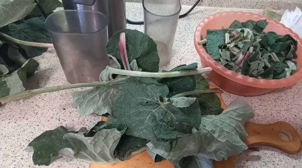 Сок этот обладает целебными свойствами. Я пришла домой, проверила все листья, убрала всех улиток, поврежденные листья, всё помыла, обсушила. Порезала на небольшие кусочки для того, чтобы удобно было соковыжималке прокручивать и давить сок.