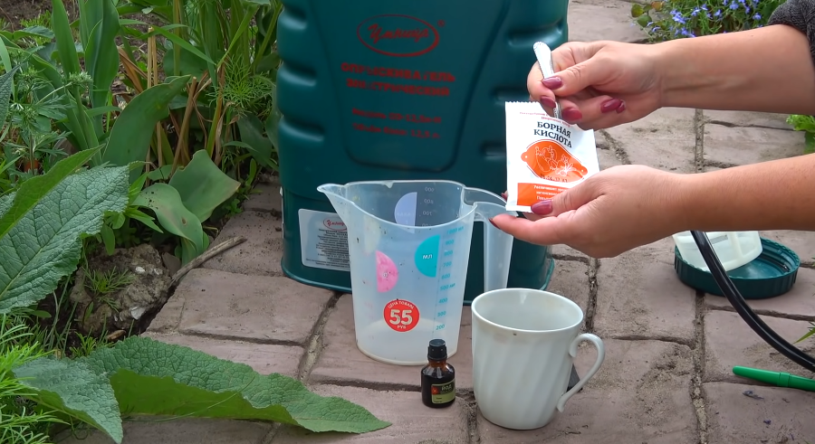 Основным компонентом этой подкормки является борная кислота. Я использую порошок борной кислоты, который можно купить в любом садово-огородном магазине. Так как борная кислота плохо растворяется в холодной воде, то я беру воду теплую и в небольшом количестве воды растворяю пол чайной ложки порошка борной кислоты. В теплой воде она легко растворяется. И добавляю также в раствор.