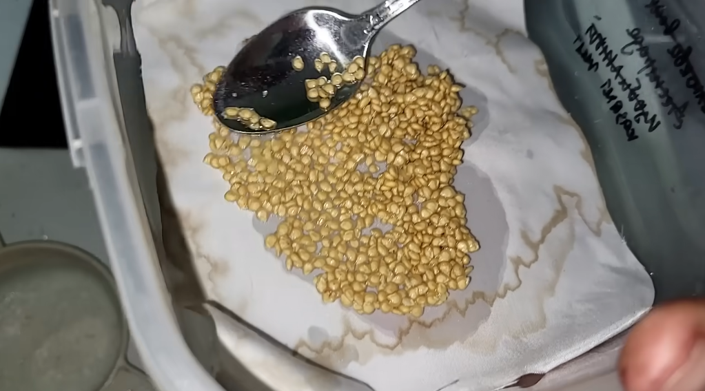 Затем я беру контейнеры, в контейнерах у меня лежит ткань, можно взять вообще любую, любую ткань ненужную, только не ворсистую, у меня ткань от рубашек мужских, и буквально за сутки семена просыхают. Я раскладываю на эту ткань семена и размазываю по ткани, ложечку берете и всё это размазываете, кто-то кладет на бумагу, но семена могут прилипнуть к бумаге, их очень неудобно потом вытаскивать, ни в коем случае не кладите семена никогда на салфетки, они сто процентов там прилипнут к этой салфетке, самое оптимальное — это ткань, потом вы легко сдираете с ткани эти семена, можно даже эту ткань пожулькать, и тогда семена равномерно отойдут. Сначала высохнет ткань, потом начнут сохнуть семена, очень удобно.