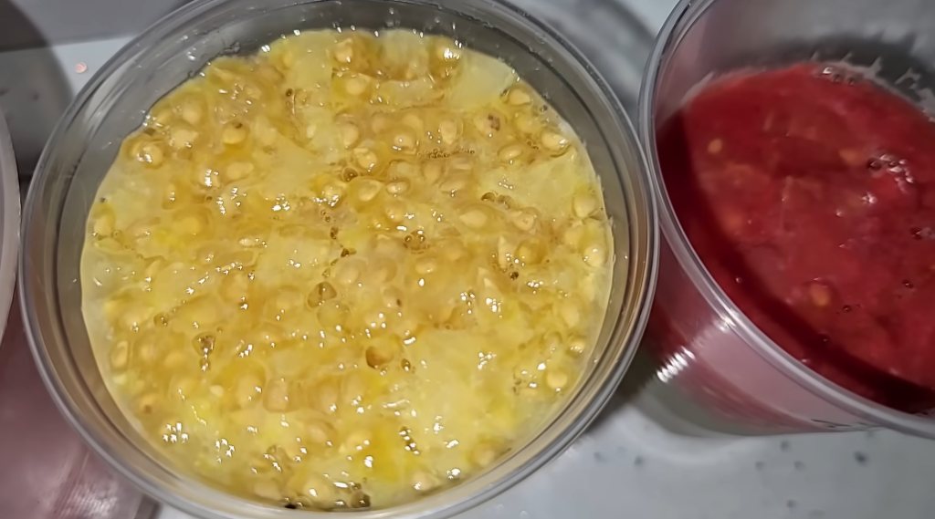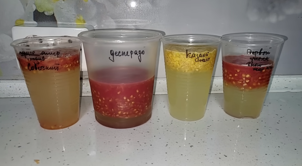 В принципе, это самый простой способ вытащить семена из томата, очень просто и легко вынимаются семена. Сразу скажу, вы подбираете емкость для того, чтобы сбраживать семена, можно выбрать пластиковые стаканчики, у меня томат большой, у меня налило 200 миллилитров жидкости примерно.