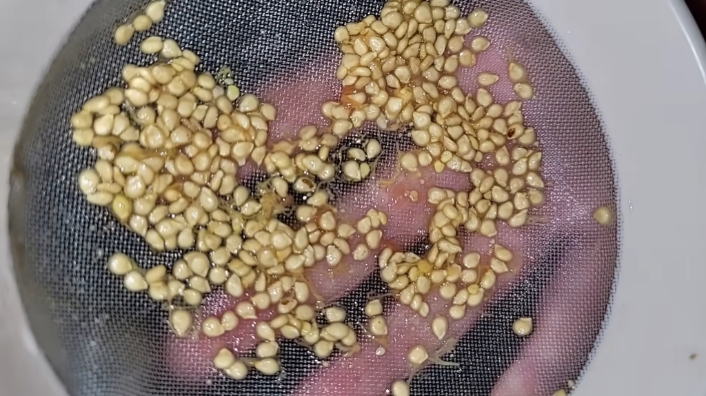 Далее берете сито, бывают семена совсем мелкие, берите сито совсем мелкое и промываете в проточной холодной воде от ошметков, они очень легко отходит, хорошо промываете, потому что чем хуже вы промоете, тем больше слизи останется на семенах.