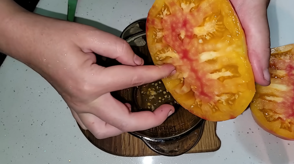 Итак, разрезаем томат поперек, потому что именно в такой позиции раскрываются все эти семенные окошечки, и из них будет очень легко достать семена. Многие советуют доставать ложечкой, но на самом деле это не очень удобно, потому что дырочки могут быть маленькие очень, куда ложечка не пролезет, пальцем оптимальней всего вытаскивать такие семена, это, во-первых, удобно, вы чувствуете, что там есть еще, и чувствуете, насколько глубоко может быть там семена спрятаны.