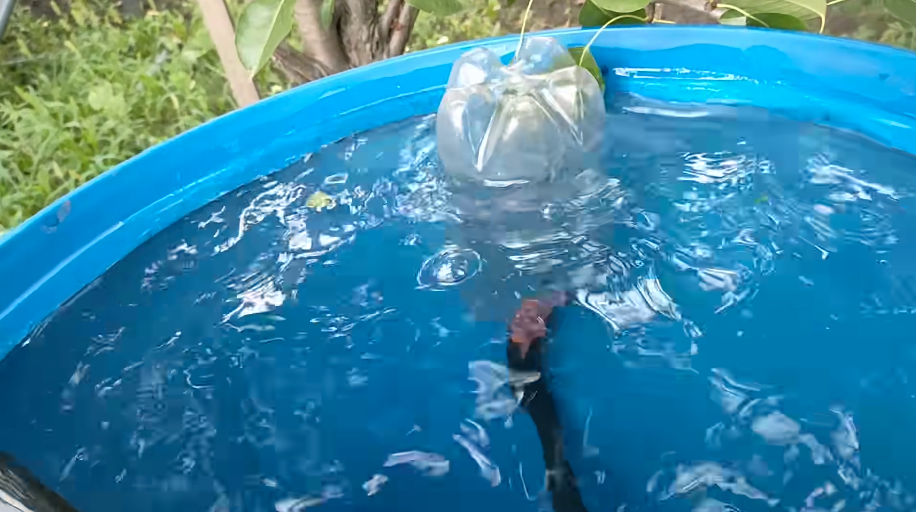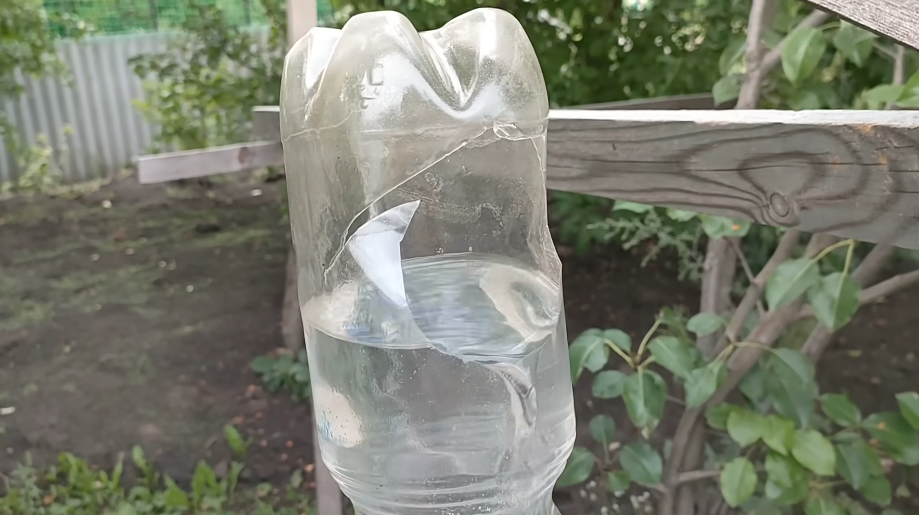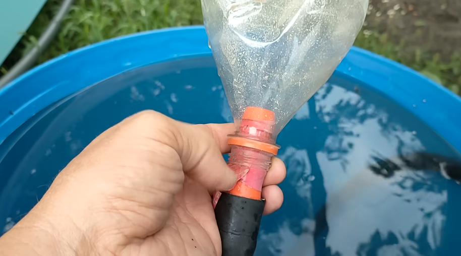 Дальше опускаем бутылку в бочку с водой, поднимаем и ждем, пока из этой бутылки начнет уходить вода в шланг, воздух вышел и начинает уходить вода.