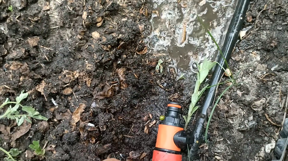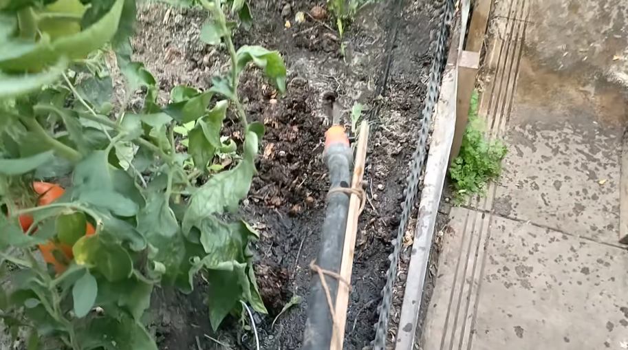 Я к шлангу привязал такую рейку, и можно поливать грядки хоть с этой стороны, хоть с другой. Грядку поливать хоть с этой. И еще что интересно, у меня переходник на шланге с краном, перекрыли его, и водичка не течет.