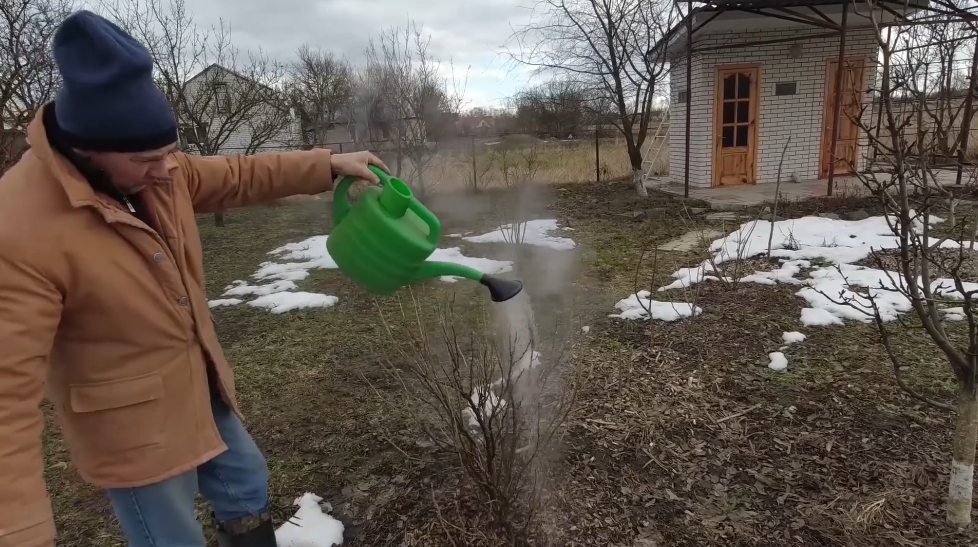 Обработка деревьев и кустов от вредителей, от жучков и разных заболеваний. Самое первое, что мы делаем, это когда еще не сошел снег и еще иногда ночью бывает холод, минусовая температура, мы поливаем кипятком ветки смородины, чтобы убить переживших зиму вредителей и какие-то болезни, это нужно производить как можно раньше, пока еще не набухли почки на ветках смородины, а они набухают самые первые.