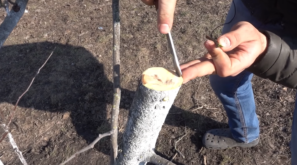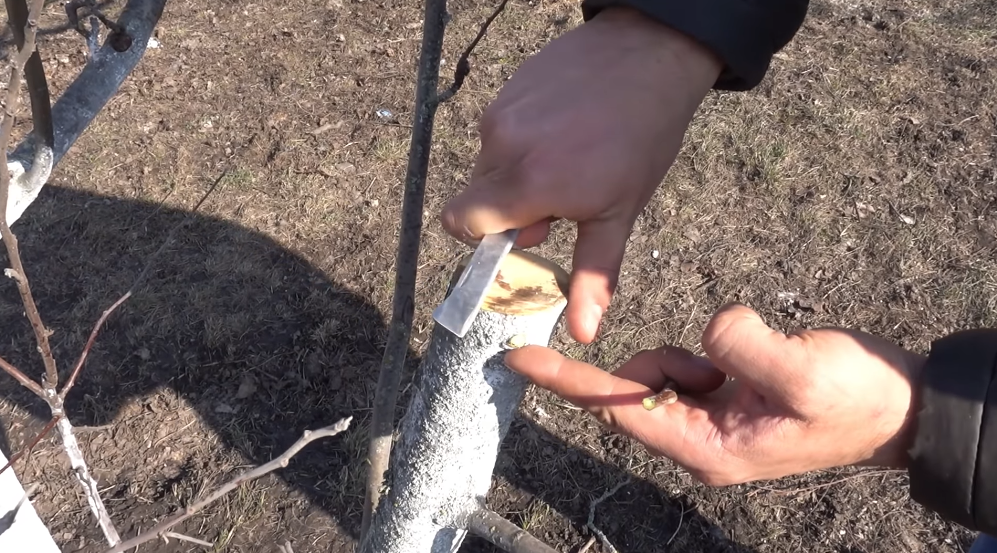 Сейчас мы берем прививочный нож и аккуратно очищаем вокруг спила.