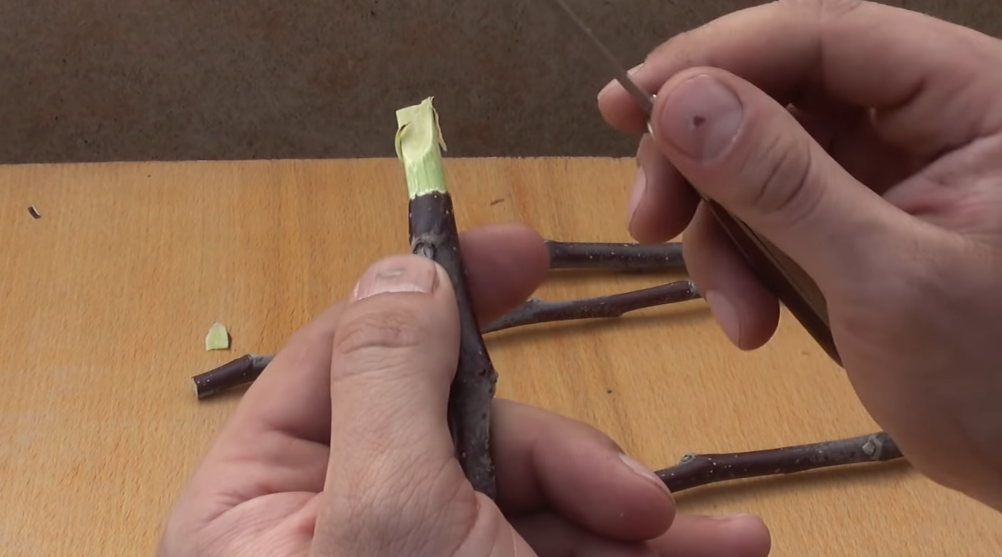 Далее самое главное, ниже почки вот эту часть мы срезаем кору, и тут нужен очень острый нож, это должен быть или прививочный, или канцелярский, и срезаем такими очень легкими движениями, нам нужно дорезать до камбия, и ни в коем случае его не снять, живые зеленые клетки, вот за счет них идет прорастание.