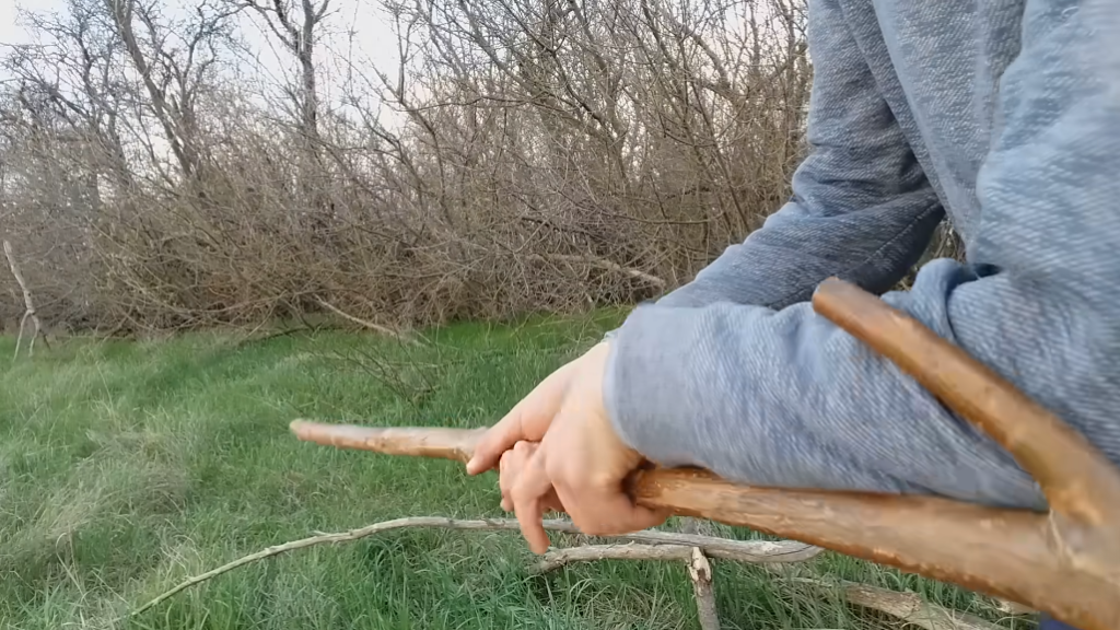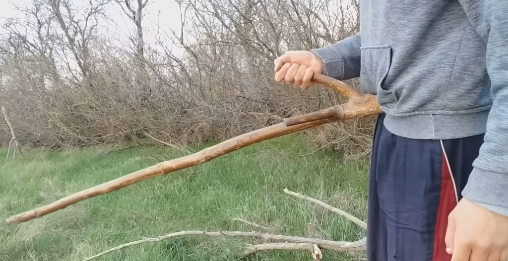 Отдельная категория методов основана на применении подручных средств, а именно палки, трости, ветки и так далее, если Вы часто ходите куда-то собирать что-то, пасти и так далее, то лучше завести такую палку. Если взять тоненькую маленькую, то ударный эффект от нее недостаточно большой, чтобы сбить всех клещей, а если взять большую, то при манипуляциях рука достаточно быстро будет уставать, поэтому я себе сделал такой посох, он с двумя рожками, и когда я беру его, захватываю, то получается, вот эти штуки как поддержка на костыле, они помогают мне.