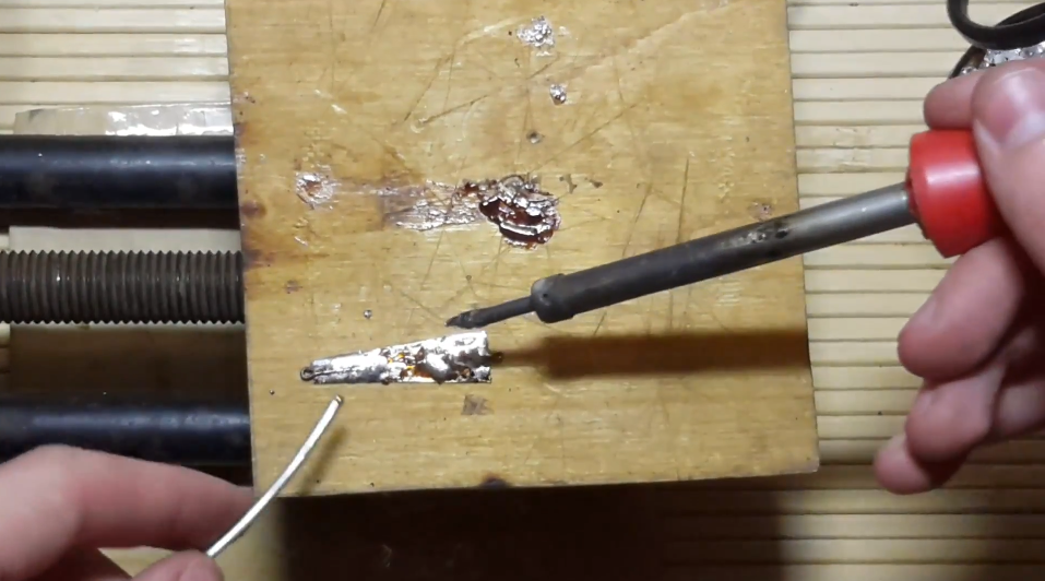 Мы из него ножницами вырезаем заготовку. Потом выравниваем и дорабатываем все края напильником до нужных нам размеров. Теперь нужно на наждачке или на напильнике зачистить ту грань, которая будет паяться.