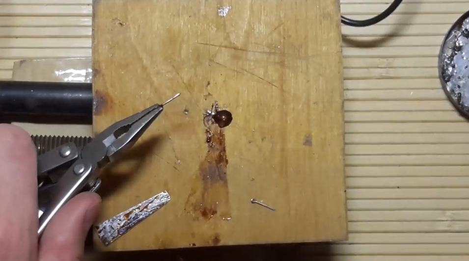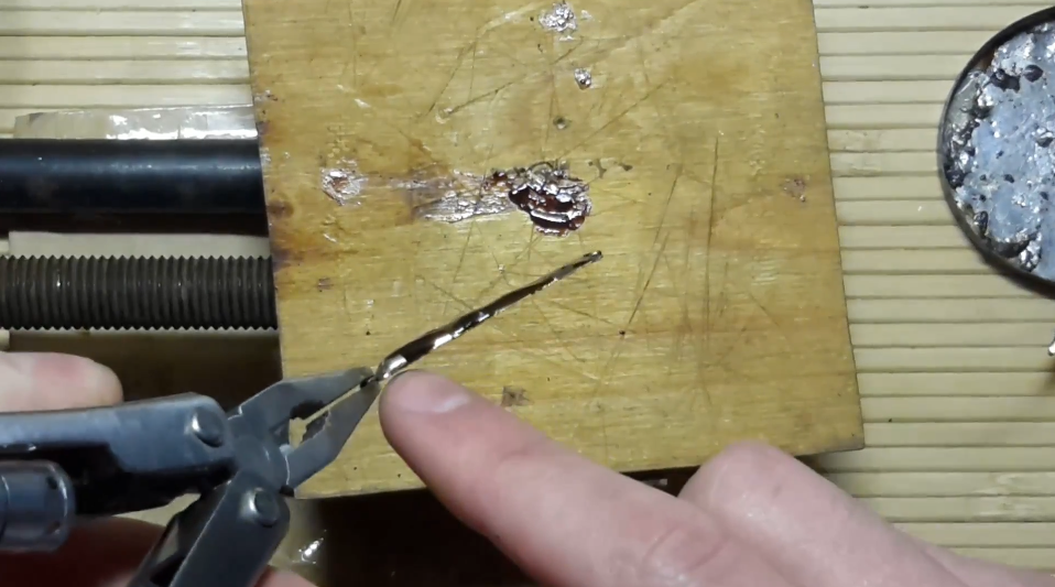 Теперь нужно залудить ушко блесны. Ушко я использую от старых крючков.