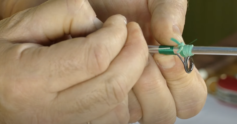 Теперь берем нитку. Это специальная монтажная нить, которой приматывают пропускные кольца на спиннинговых удилищах. Эта нить характерна тем, что она очень хорошо пропитывается различными видами клея, чаще всего эпоксидного. И эпоксидный клей должен быть разведен до довольно таки жидкого состояния. Чтобы все у нас получилось красиво и грамотно.