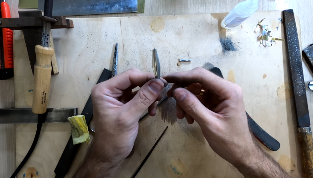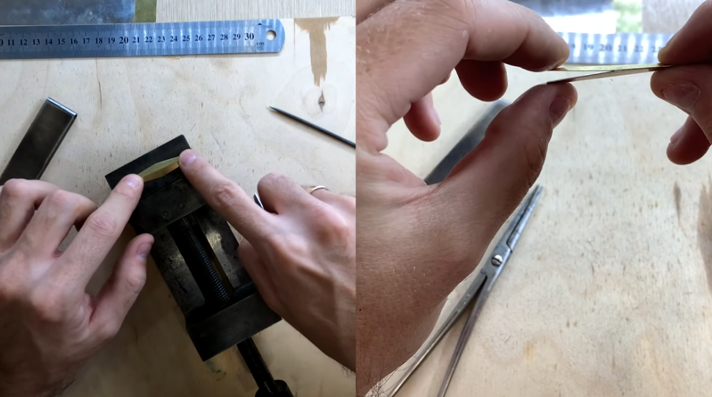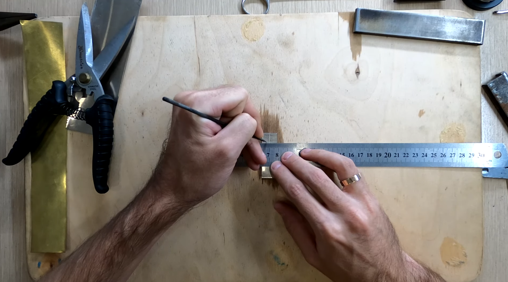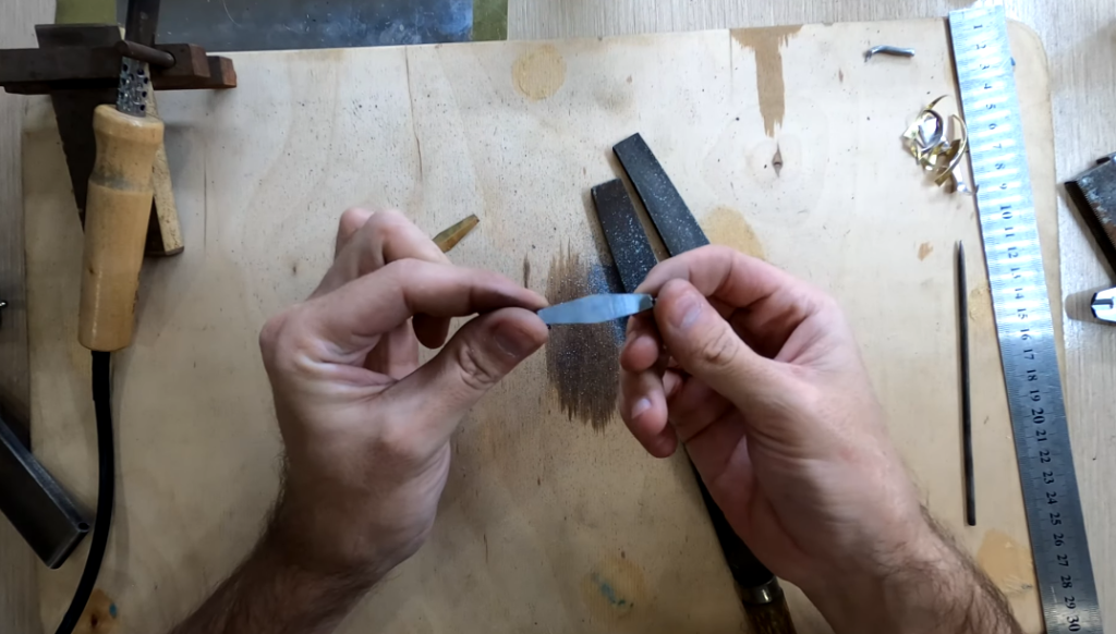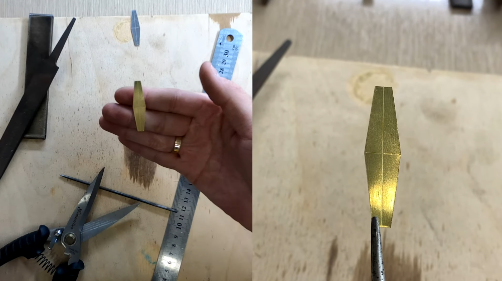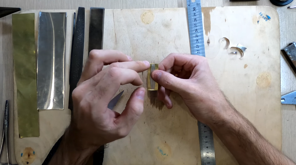 Теперь берем нашу латунь и повторяем данную процедуру еще раз: берем примерно такой же небольшой кусочек, отрезаем его, также прокатываем, для того чтобы пластина была ровной. Здесь можно поступить двумя способами: либо вы накладываете уже вырезанную вами заготовку на латунь, обводите ее по контуру, но тогда у вас будет погрешность где-то около полумиллиметра из-за того, что линия прикосновения будет толще.