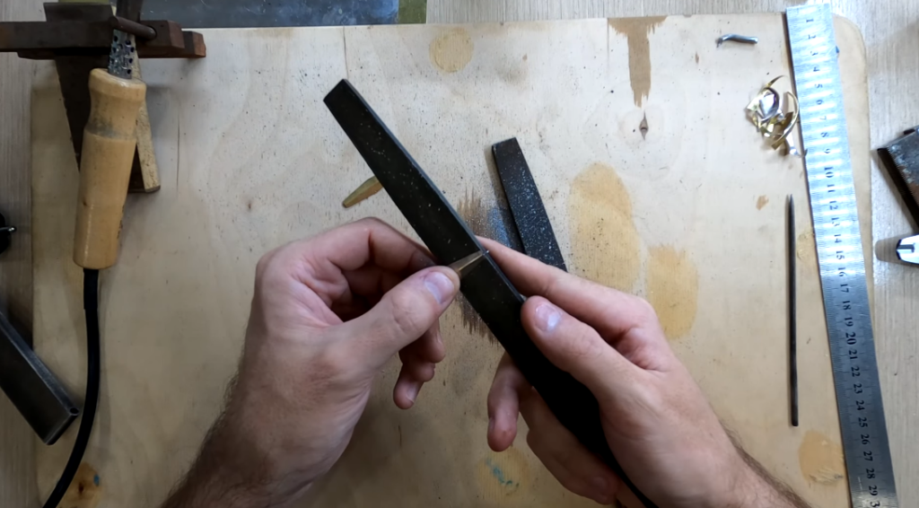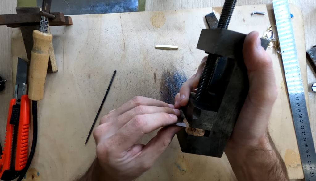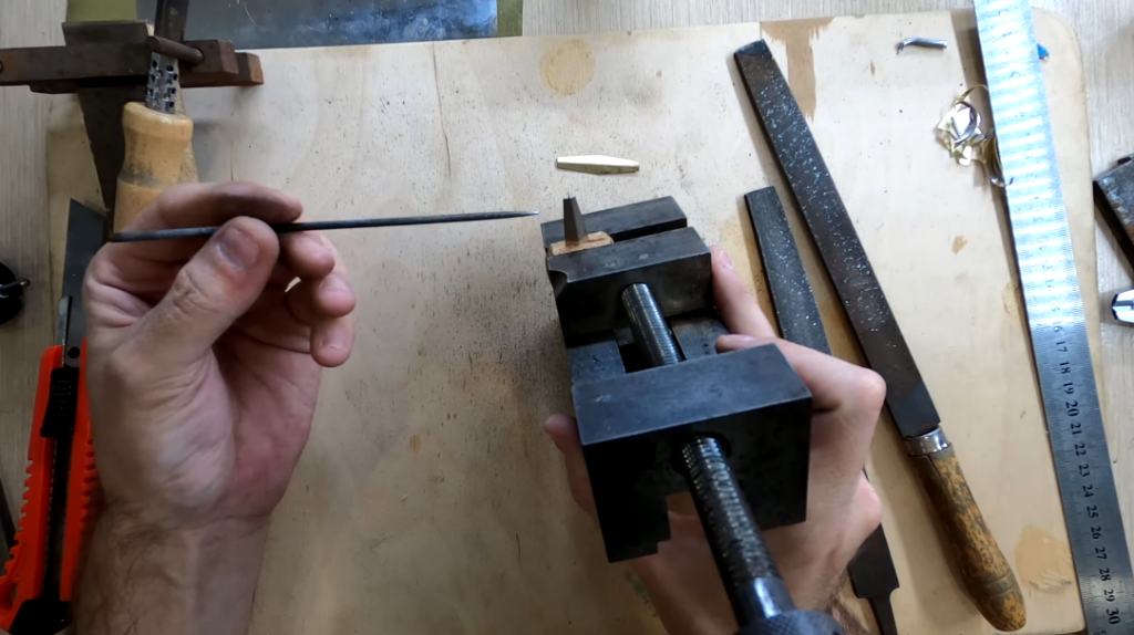 Вот-вот мы закончили обточку первой коронки, теперь она у нас сточена заподлицо, но не выведена в плоскости, ее пока откладываю в сторонку, и такую же манипуляцию повторяем с латунной коронкой, сначала грубым напильником, потом менее зернистым.