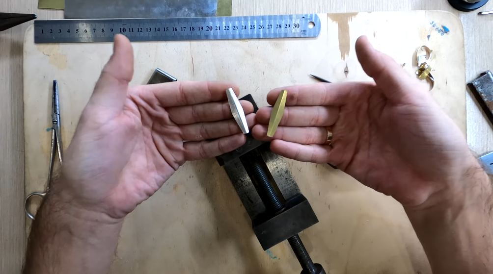 Первая заготовка у нас готова, соответственно, дальше мы сделаем такую же заготовку из латуни, потому что блесна у нас симметричная и двусторонняя, в дальнейшем покажу, как это делается.