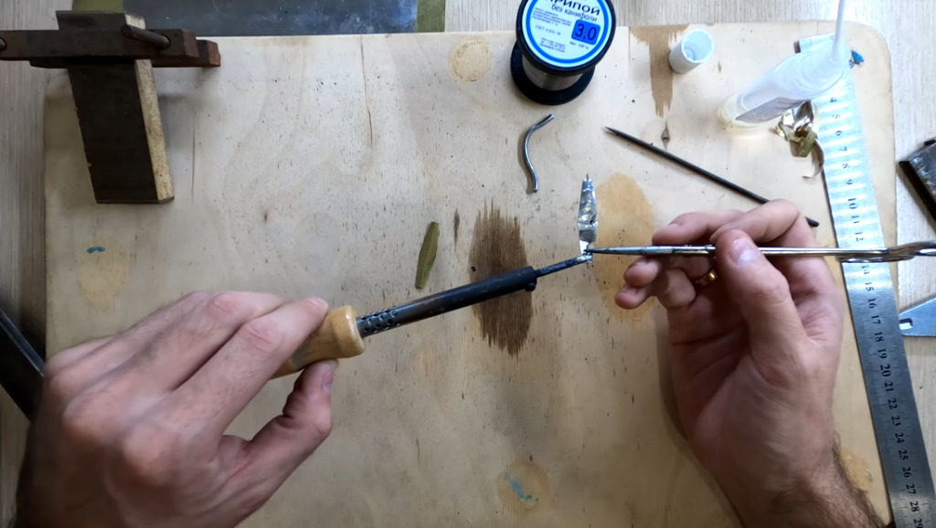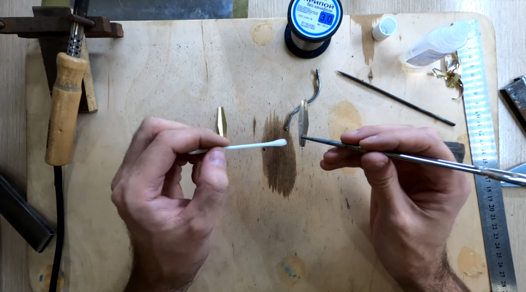 Дальше мы берем замоченную в кислоте ватную палочку, смачиваем слегка, нос блесны, берем припой и начинаем пропаивать первую коронку, желательно делать сразу вровень, чтобы в будущем уже не стачивать много припоя и не расходовать его зря.