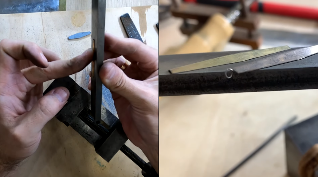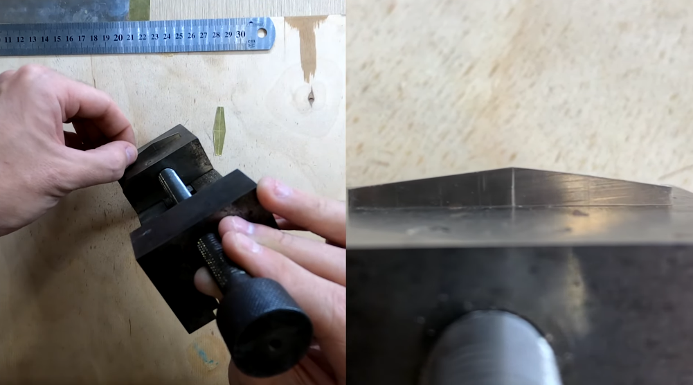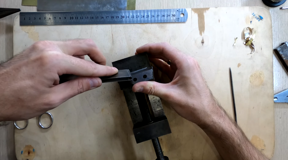 Чтобы угол был идеально ровным, нужно выставить линию в тисках, чуть-чуть торчащую вверх, так как губка при загибе она будет принимать эту линию, и получится очень ровный изгиб.