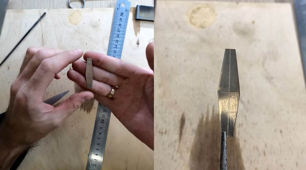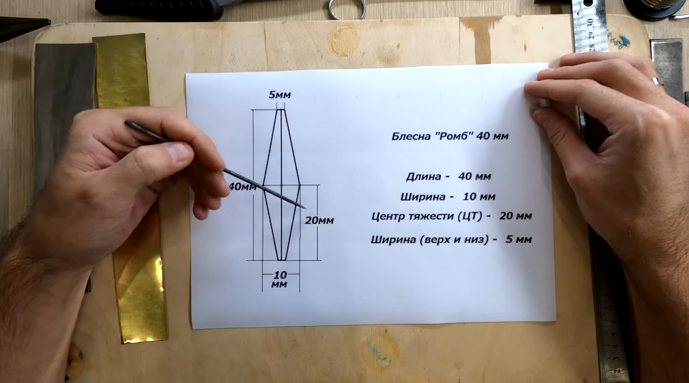 Для наглядности давайте покажем вам чертёж, сегодня мы делаем блесну «Ромб» 40 миллиметров, размеры: длина блесны 40 миллиметров, верхняя часть и нижняя часть 5 миллиметров, центр тяжести находится от носа в 20 метрах, и ширина обрисую 10 миллиметров, здесь всё это написано, можете посмотреть и сохранить для дальнейшего. Будем делать двустороннюю блесну из латуни и мельхиора, мельхиор у нас 0,3, латунь у нас 0,25.