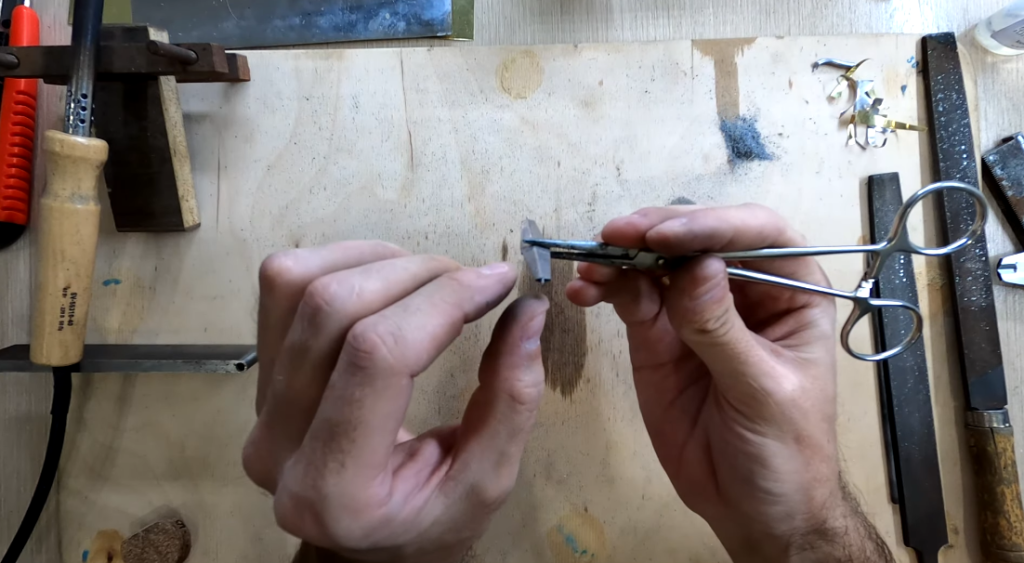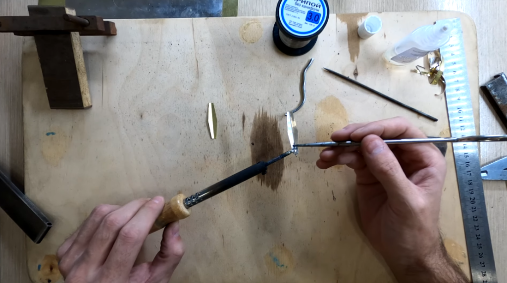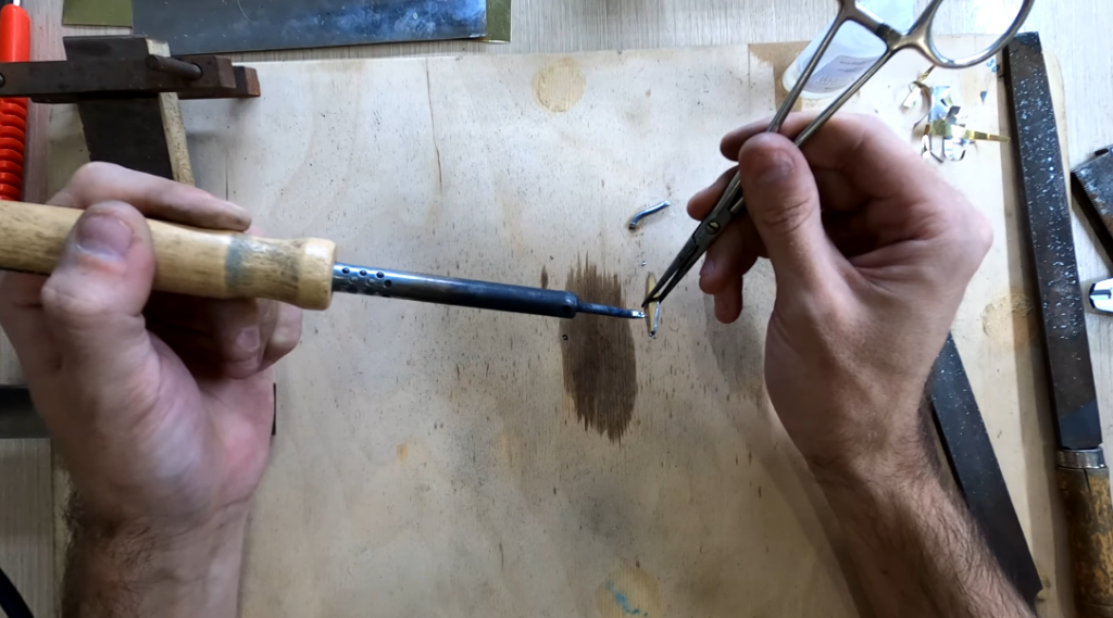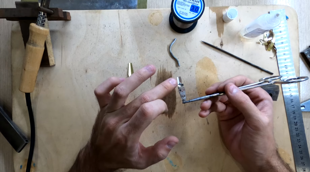 Блесна у нас почти остыла, и вот это место, которое мы сохранили, сюда мы будем впаивать сразу второе ушко, в будущем две коронки при изгибании создают одну целую плоскость, и ушки будут стоять по центру. И таким же образом зажимаем его и также центруем по оси изначальной, и начинаем пропаивать оставшийся конец.
