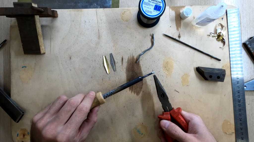 После пайки переходим к формированию итоговой блесны, сейчас нам нужно будет обточить весь наплыв от припоя, пройтись еще раз по всем граням, посмотреть на их симметричность, взвесить блесну, ну и показать вам мою работу.