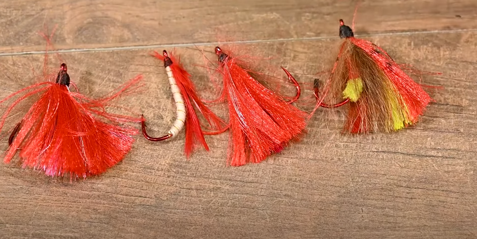 Дальше привязываются мухи. Ну, к мухам у каждого свой подход. Я показываю именно на то, что лично я ловлю. В моих предпочтениях мухи красного цвета. У меня здесь четыре вида, они тут немножко есть с желтизной, есть белое основание. В принципе, скажем так, есть, конечно, разница. Но когда горбуша идет массово, то есть не единичные, то большую разницу я не замечал. То есть на какие-то, может, клюёт чуть получше, на каких-то похуже, но в принципе, разница невелика.