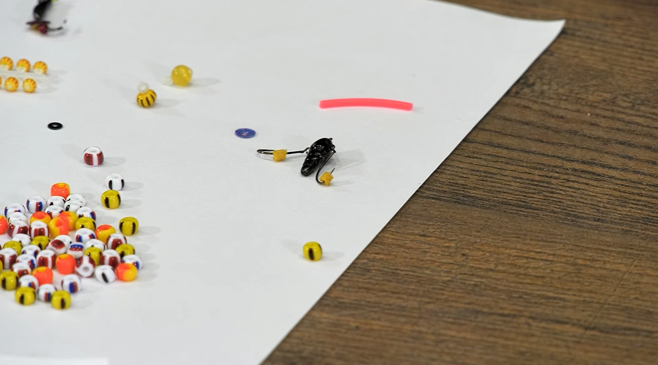 Опять же чертик, он у нас с тремя крючками. То есть изначально, когда чертики только появились и для них стали писать журналы Спортивное рыболовство, то есть рекомендовалось на тройники вешать три кембрика: белый, красный, зеленый. То есть чисто кембрик, не бисер, не что. Потом со временем как бы люди перешли, стали вешать бисер на чертик. Можно вешать как одну большую бисерину, только на один крючок и до трёх бисеринок, то есть на каждый крючочек. соответственно. желательно, чтобы бисеринки достаточно активно тоже по крючкам ходили и стопорить их также кусочком кембрика на больших вариантах маленькие бисеринки на маленькие бисеринки.