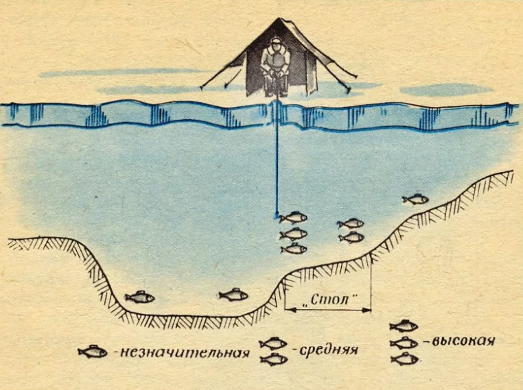 Стайки ходят выше дна, но если мы на потенциальной дорожке прохода этих стаек, сделаем восемь лунок их закормим, причем закормим не сильно, а таким умерено долгоиграющим прикормом.